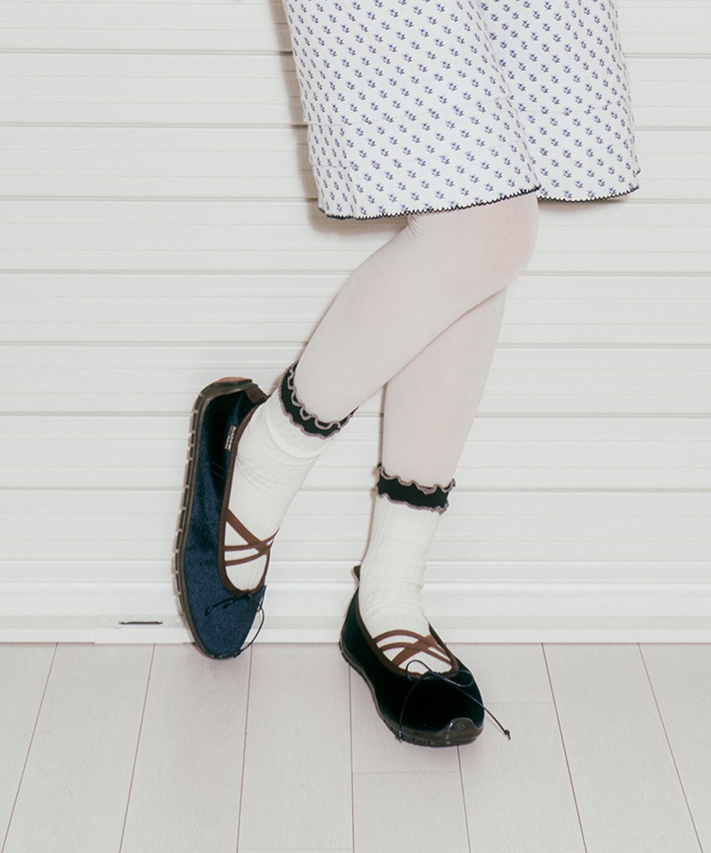 รองเท้าทรงแฟลตที่โดดเด่นด้วยการผสมผสานระหว่างพื้น Pebble กึ่งโปร่งแสงและวัสดุกำมะหยี่เนื้อนุ่มอย่างลงตัว