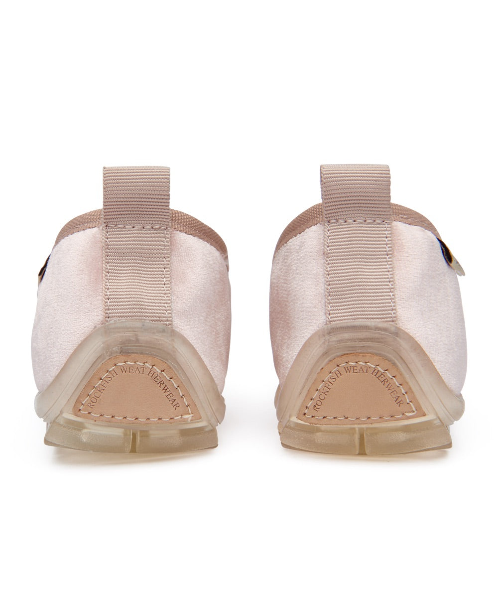 รองเท้าทรงแฟลตที่โดดเด่นด้วยการผสมผสานระหว่างพื้น Pebble กึ่งโปร่งแสงและวัสดุกำมะหยี่เนื้อนุ่มอย่างลงตัว