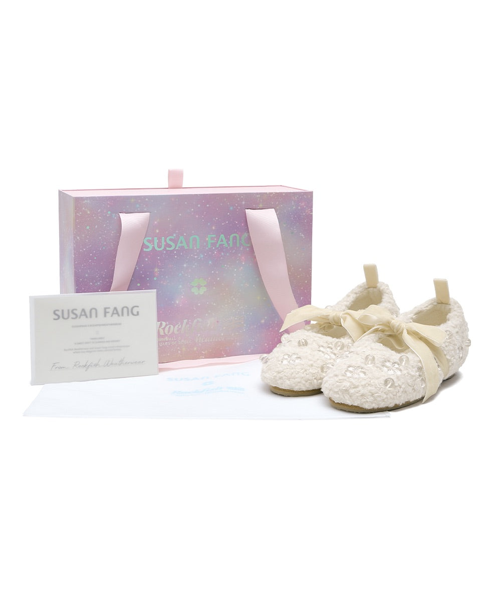 ตกแต่งด้วยลูกปัดอะคริลิกทรงดอกไม้และริบบิ้นกำมะหยี่ที่ประทับโลโก้ลาย SUSAN FANG เพิ่มลูกเล่นแบบมีมิติ ส่วนพื้นรองเท้าลายดอกไม้ช่วยเติมความยูนีคให้โดดเด่นยิ่งขึ้น