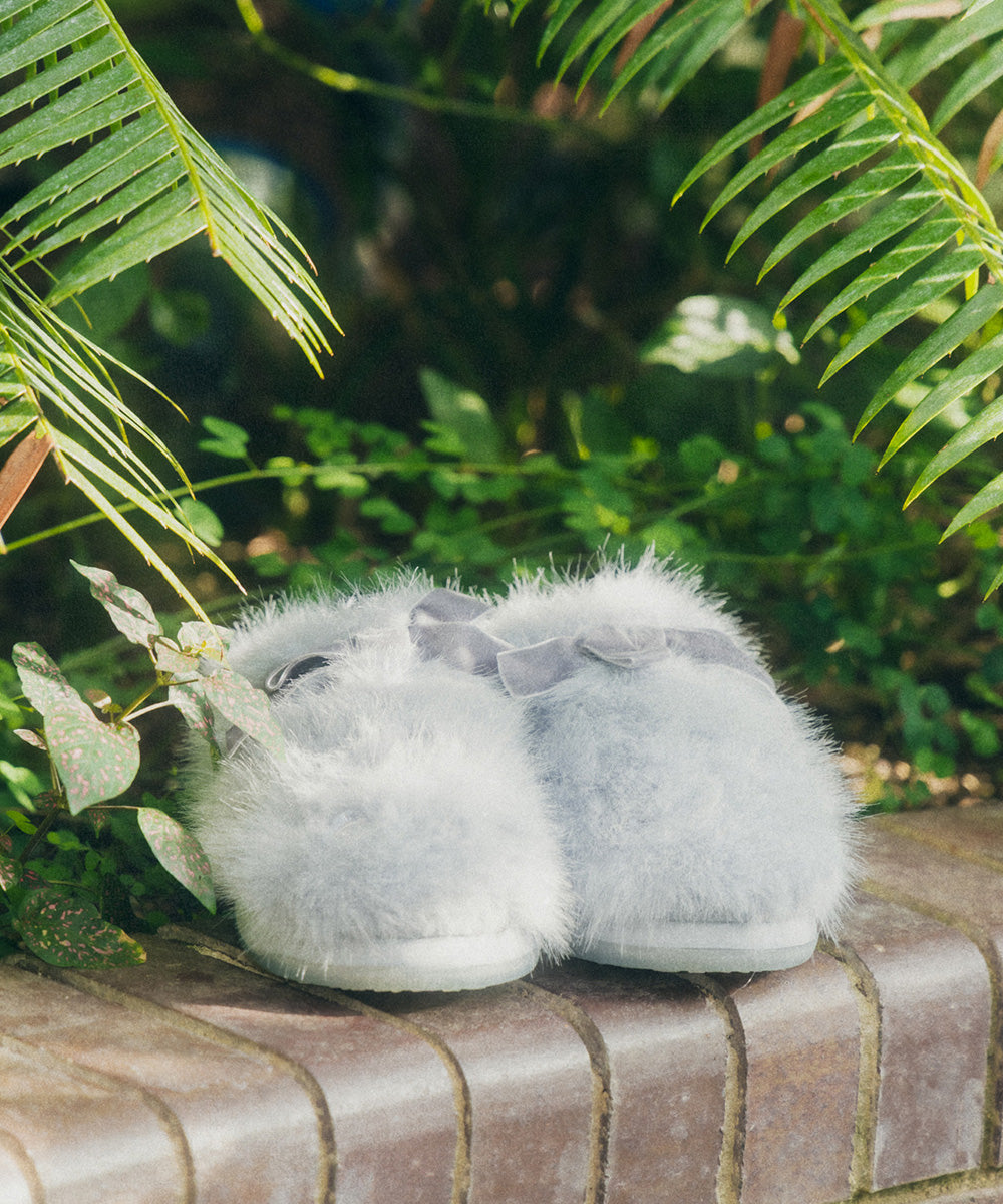 รองเท้าสวมสไตล์มัลเล่ โดดเด่นด้วยส่วนบนที่ทำจากขนเทียมเนื้อนุ่ม ริบบิ้นปรับระดับได้ และลูกปัดอะคริลิกประดับประดา มอบสัมผัสแห่งความเป็นผู้หญิงและความสนุกสนาน